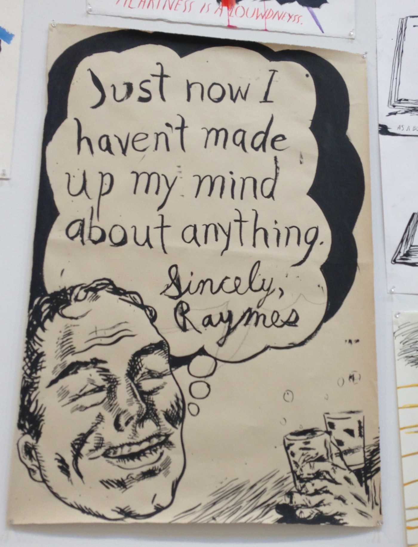 This show is good. Hastily put together becomes Pettibon. With his art, there’s a baseline expectation that you’ll see some fucked up images that you can’t unsee and he succeeds. Lots of it is trying too hard, though. The phrases painted around his works read a lot like his tweets with obvious but consistent misspellings. Built to confuse. The language also explicitly acknowledges excessive alcohol as an influence on his life and art. I was starting to wonder if he’s trying to become a punk rock Foster Brooks. Lots of hard cocks too. All over. Ray is a dirty, dirty old man, man.